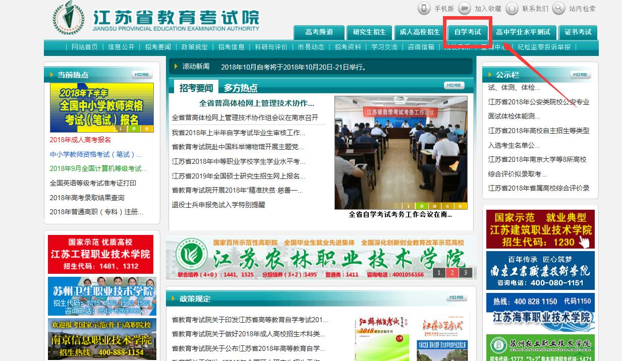 各位考生:江蘇省2018年10月自考考試通知書打印功能將于10月12日15:00正式開放,請考生抓緊時間,自行上網打印,以免影響考試。一、考試通知書打印途徑1.登錄江蘇省教育考試官網(www.jseea.cn),進入“自學考試”欄目,點擊
