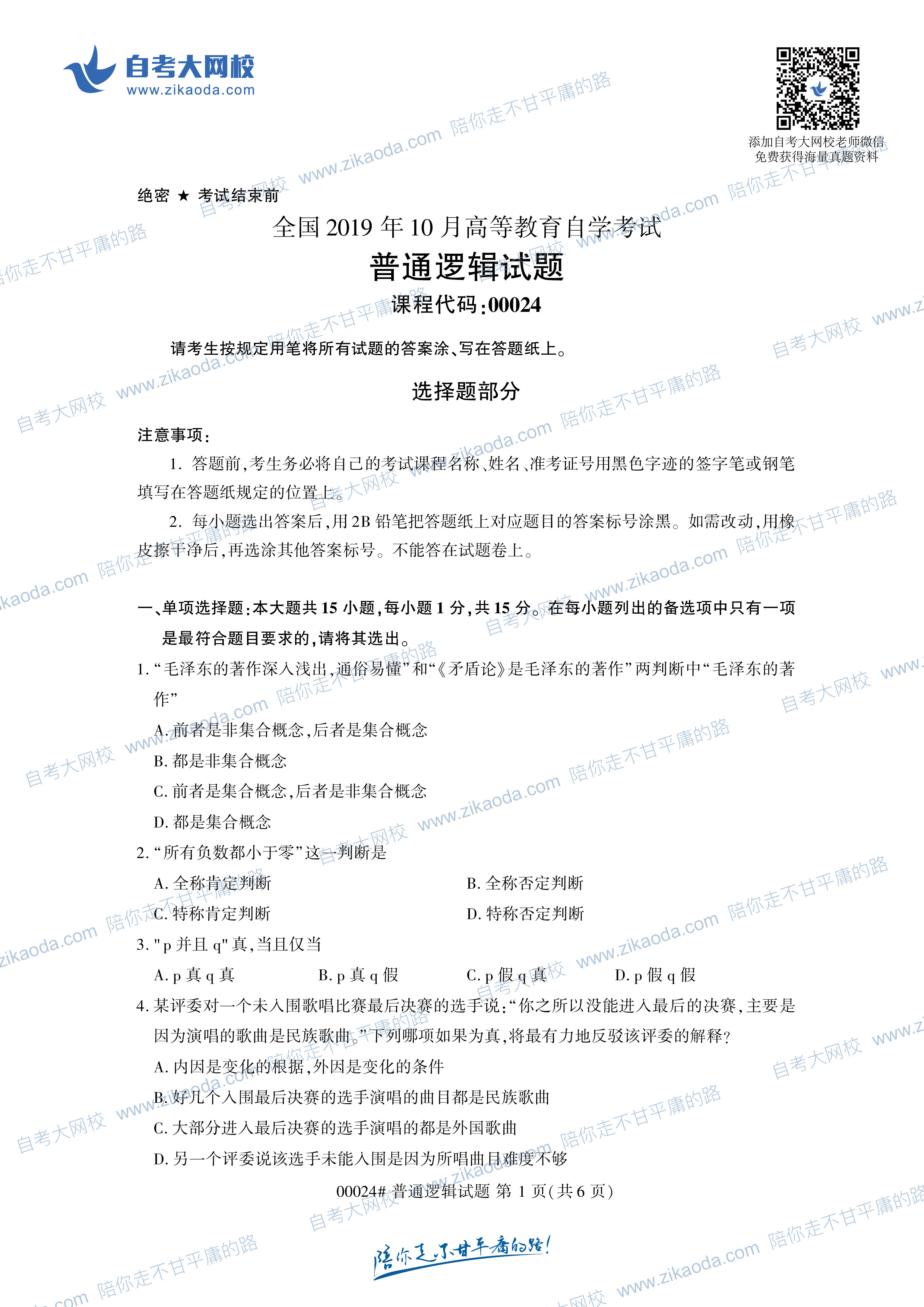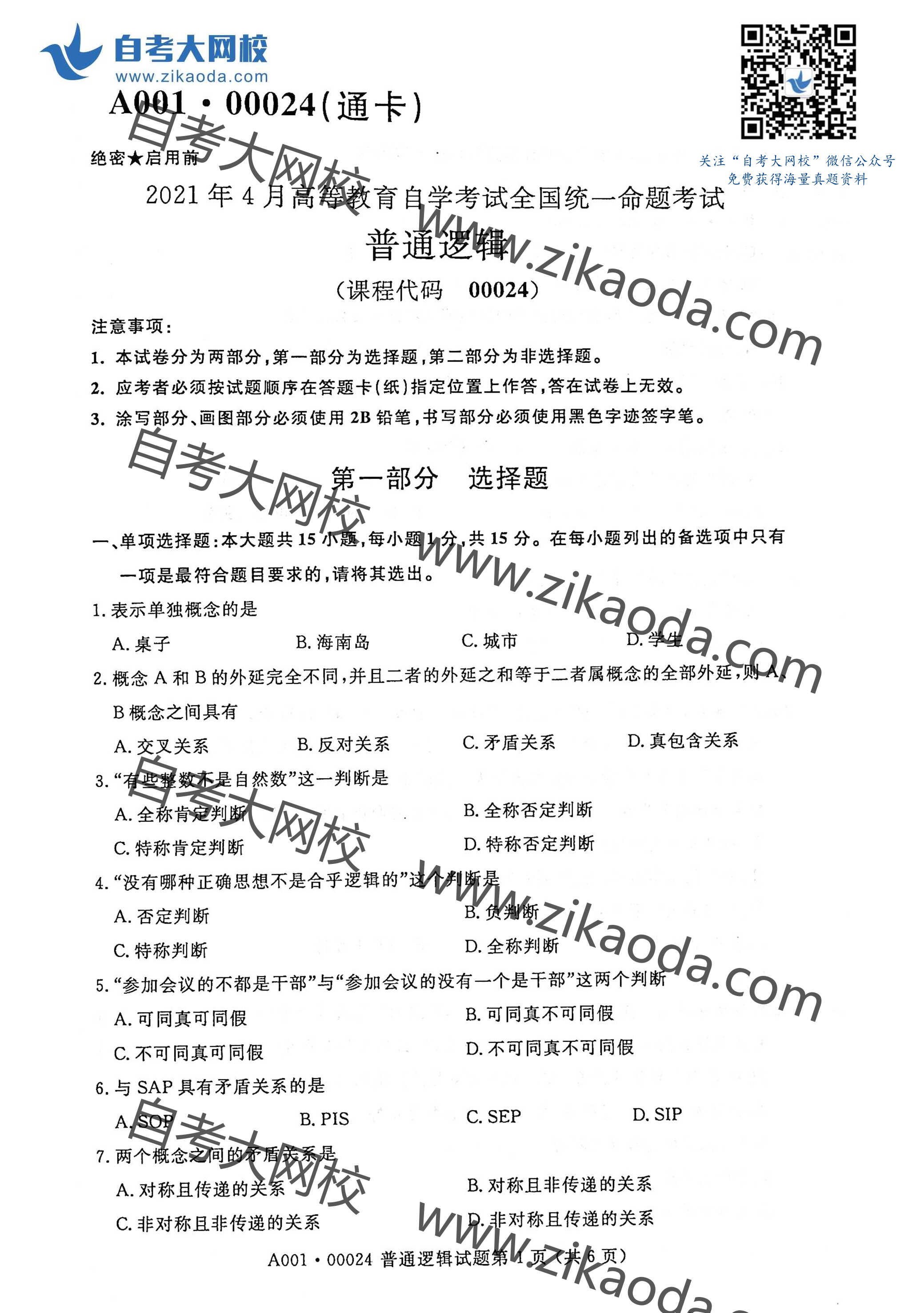 全國(guó)2021年4月自考00024普通邏輯真題試卷完整版試卷請(qǐng)聯(lián)系微信客服免費(fèi)索取備注:4月自考試卷微信客服二維碼