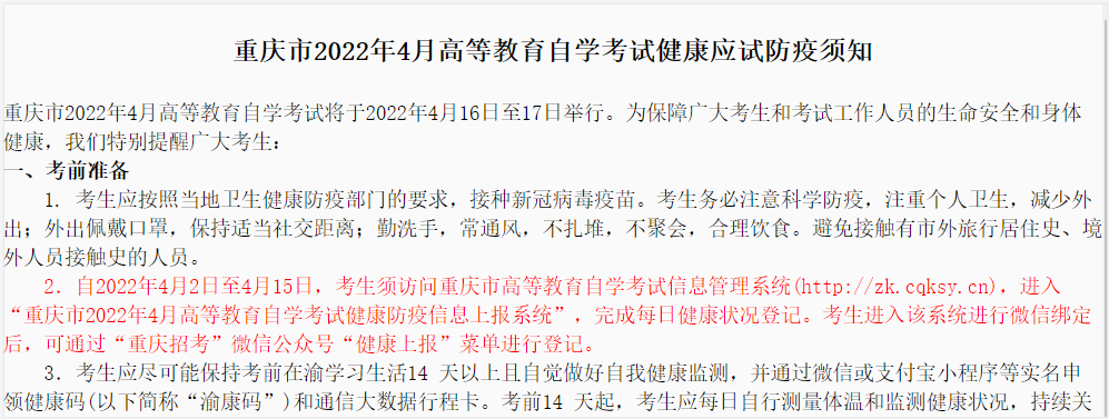 重慶市2022年4月高等教育自學(xué)考試健康應(yīng)試防疫須知