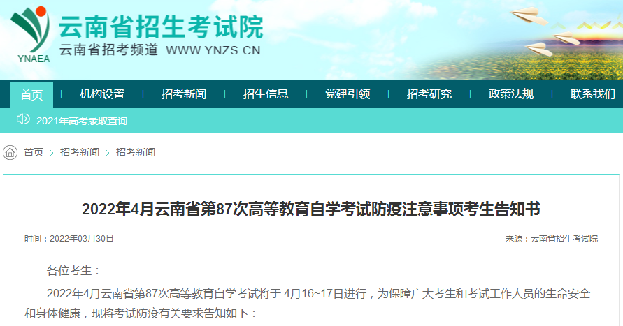 2022年4月云南省高等教育自學(xué)考試疫情防控考生須知