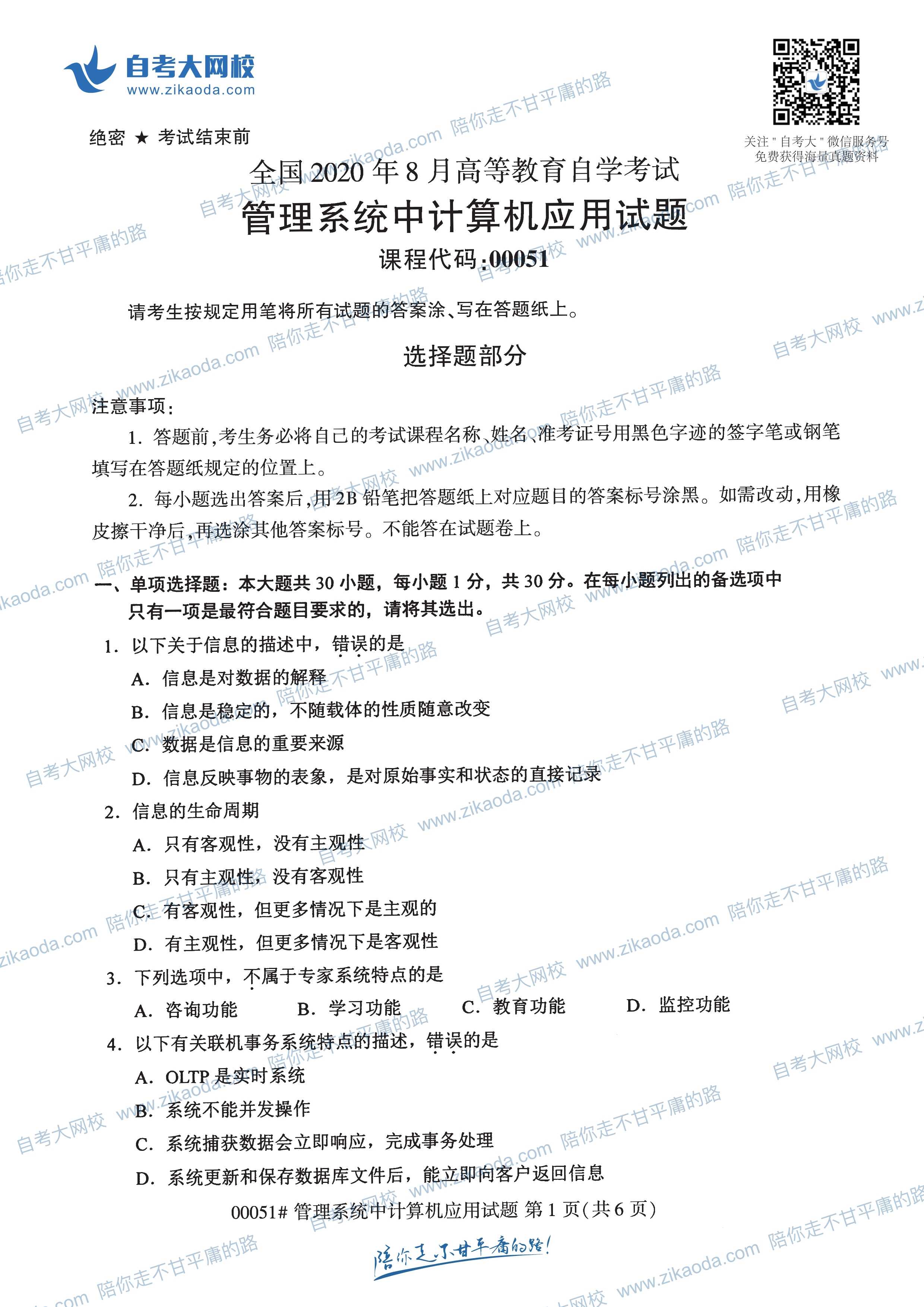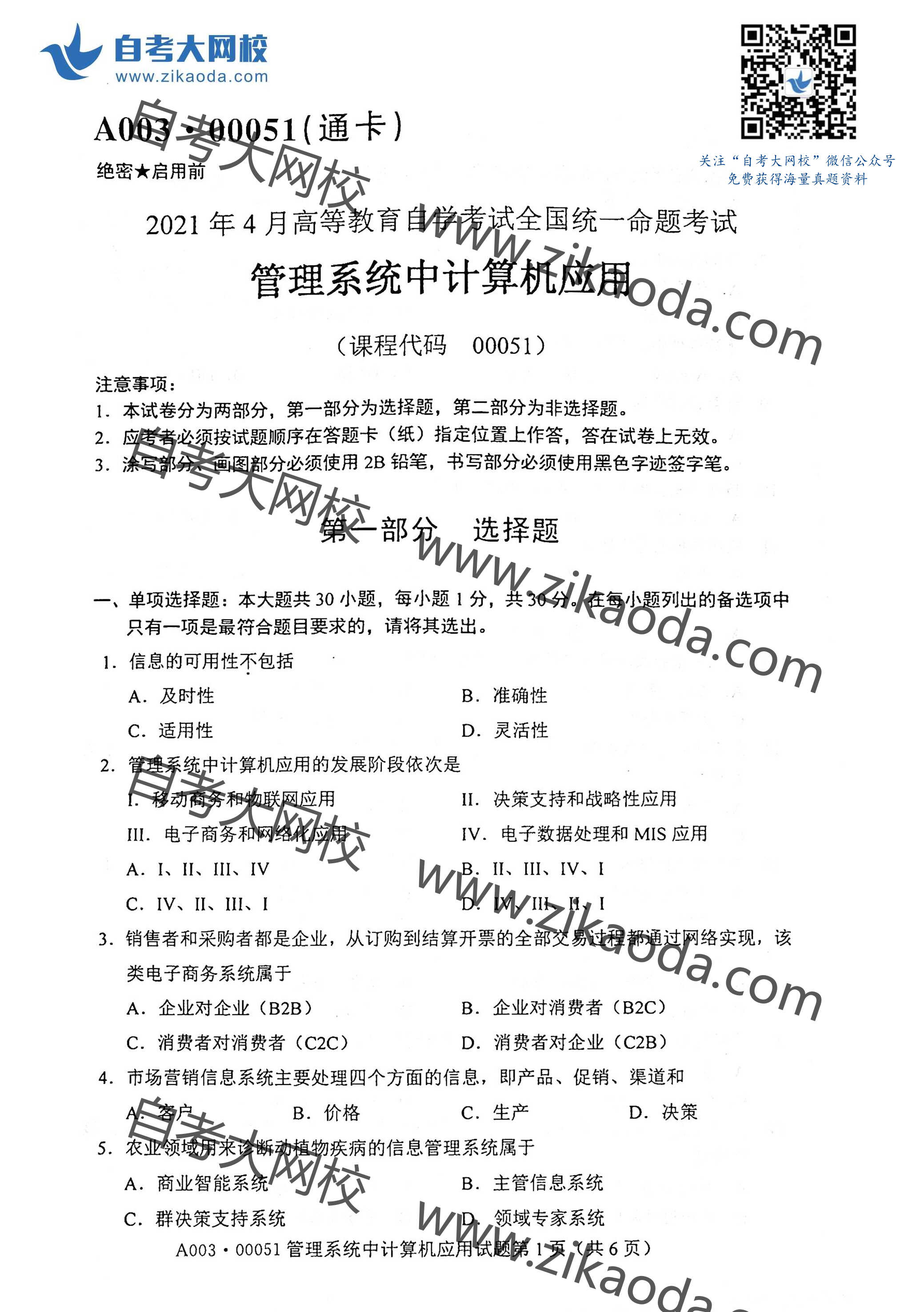 全國2021年4月自考00051管理系統(tǒng)中計算機應(yīng)用真題試卷完整版試卷請聯(lián)系微信客服免費索取備注:4月自考試卷微信客服二維碼
