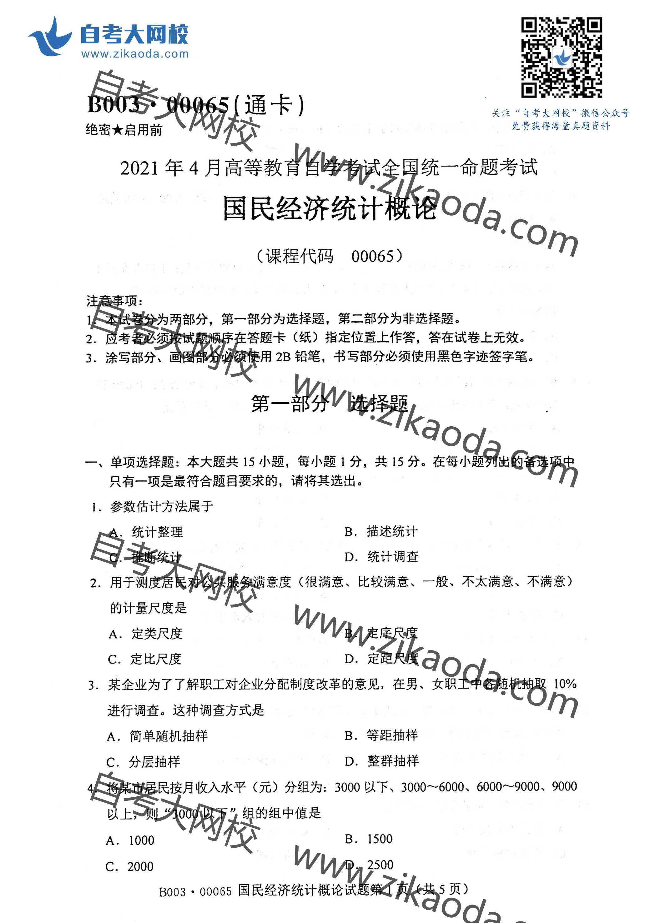 全國2021年4月自考00065國民經(jīng)濟統(tǒng)計概論真題試卷完整版試卷請聯(lián)系微信客服免費索取備注:4月自考試卷微信客服二維碼