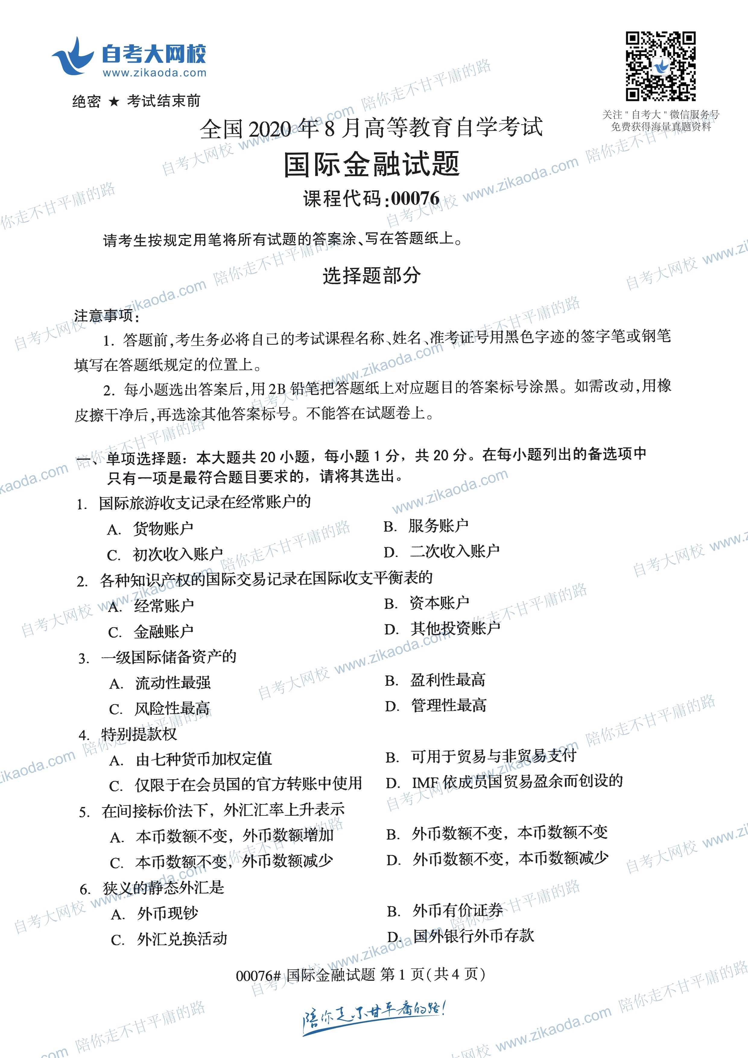 絕密★考試結(jié)束前 全國2014年4月高等教育自學(xué)考試 國際金融試題 課程代碼:00076 請考生按規(guī)定用筆將所有試題的答案涂、寫在答題紙上。 選擇題部分 注意事項(xiàng): 1.答題前,考生務(wù)必將自己的考試課程名稱、姓名、準(zhǔn)考證號用黑色字跡的簽字筆或鋼筆填寫在答題紙規(guī)定的位置上。 2.每小題選出答案后,用2B鉛筆把答題紙上對應(yīng)題目的答案標(biāo)號涂黑。如需改動(dòng),用橡皮擦干凈后,再選涂其他答案標(biāo)號。不能答在試題卷上。 一、單項(xiàng)選擇題(本大題共20小題,每小題1分,共20分) 在每小題列出的四個(gè)