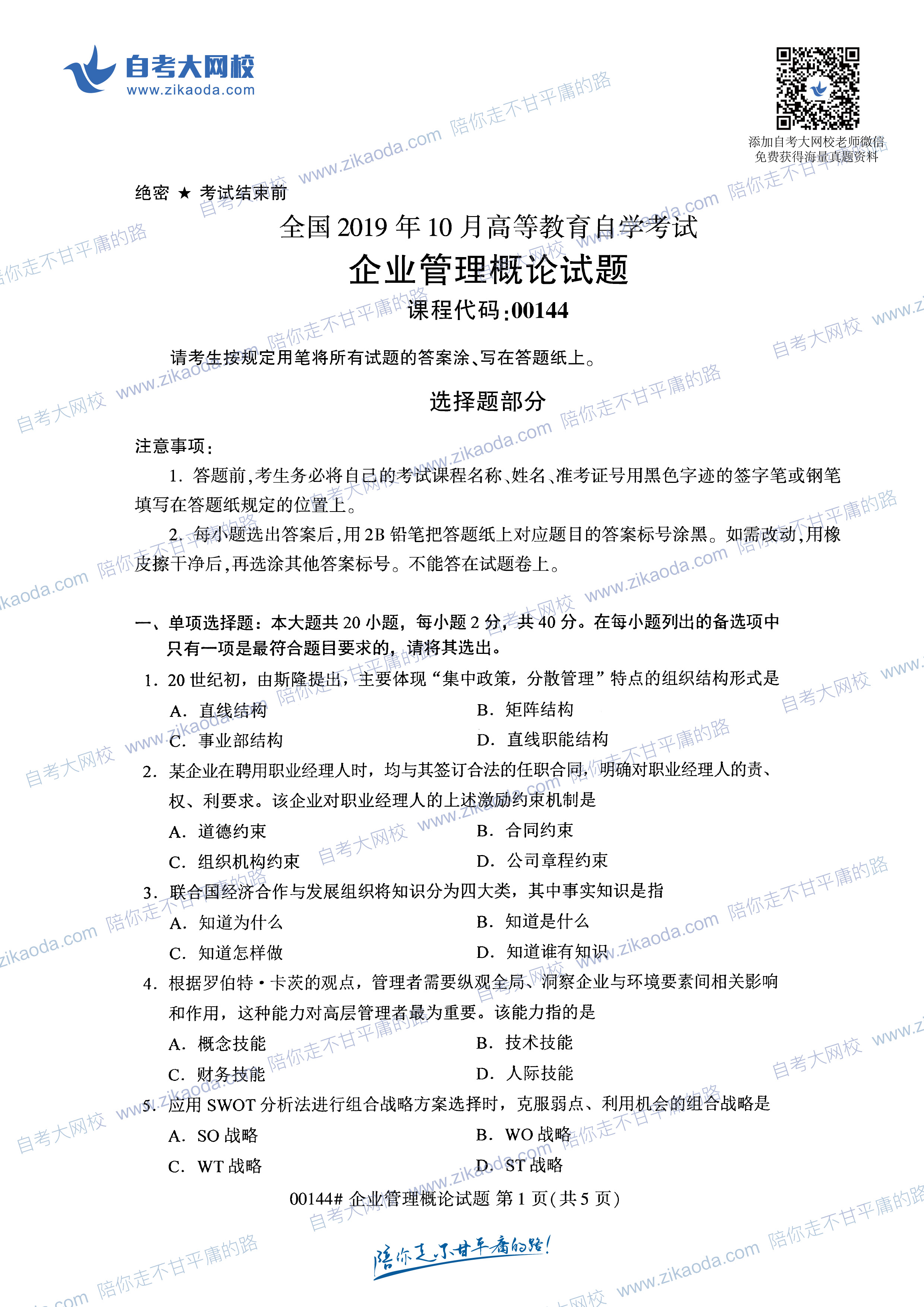 江蘇自考網(wǎng)回答:目前江蘇省教育考試院已經(jīng)公布了,江蘇省2023年4月自考教材計劃表,從教材計劃表內(nèi)容可知,自考00144企業(yè)管理概論教材代號是001441,該門課使用的教材名稱是:教材名稱,作者:閆笑非主編主編,這門課指定的教材出版社是:中國人民大學(xué)出版社,出版社時間是[班次]版次。