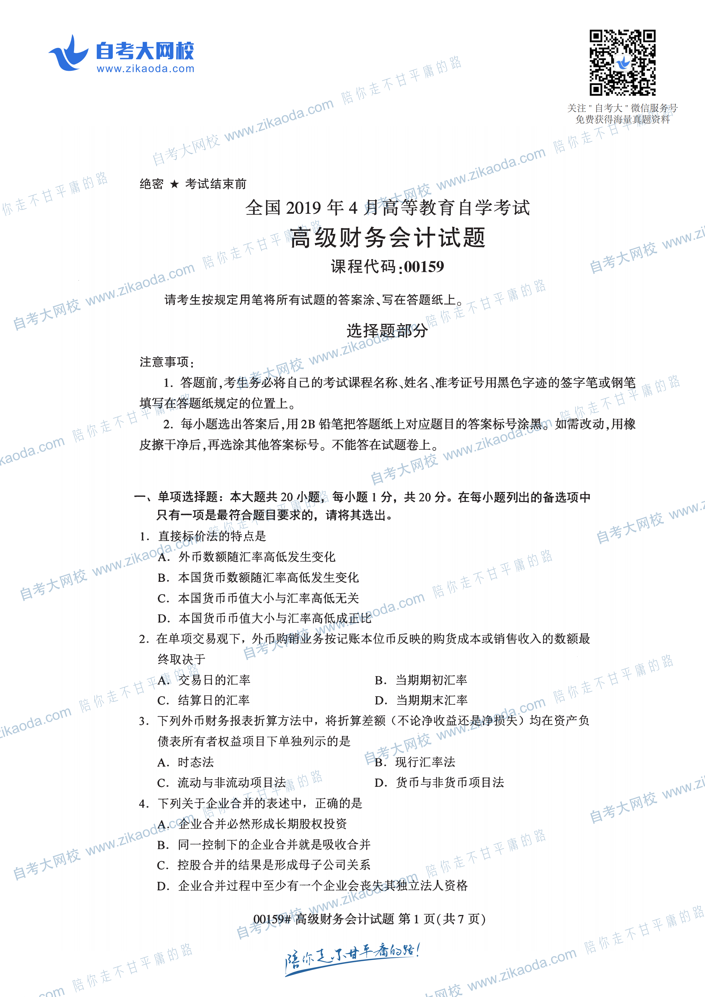 全國(guó)2019年4月自考00159高級(jí)財(cái)務(wù)會(huì)計(jì)真題試卷免費(fèi)下載