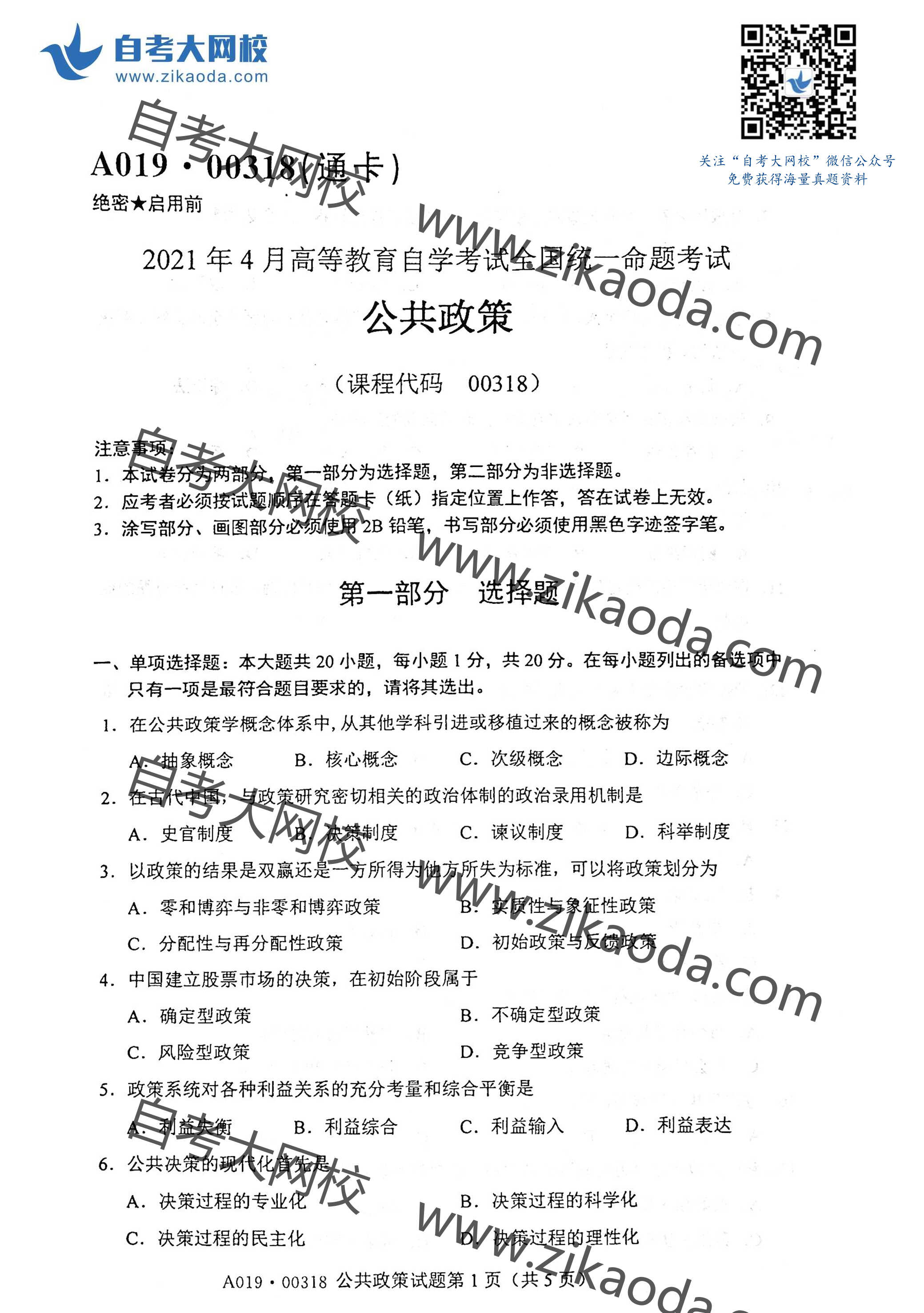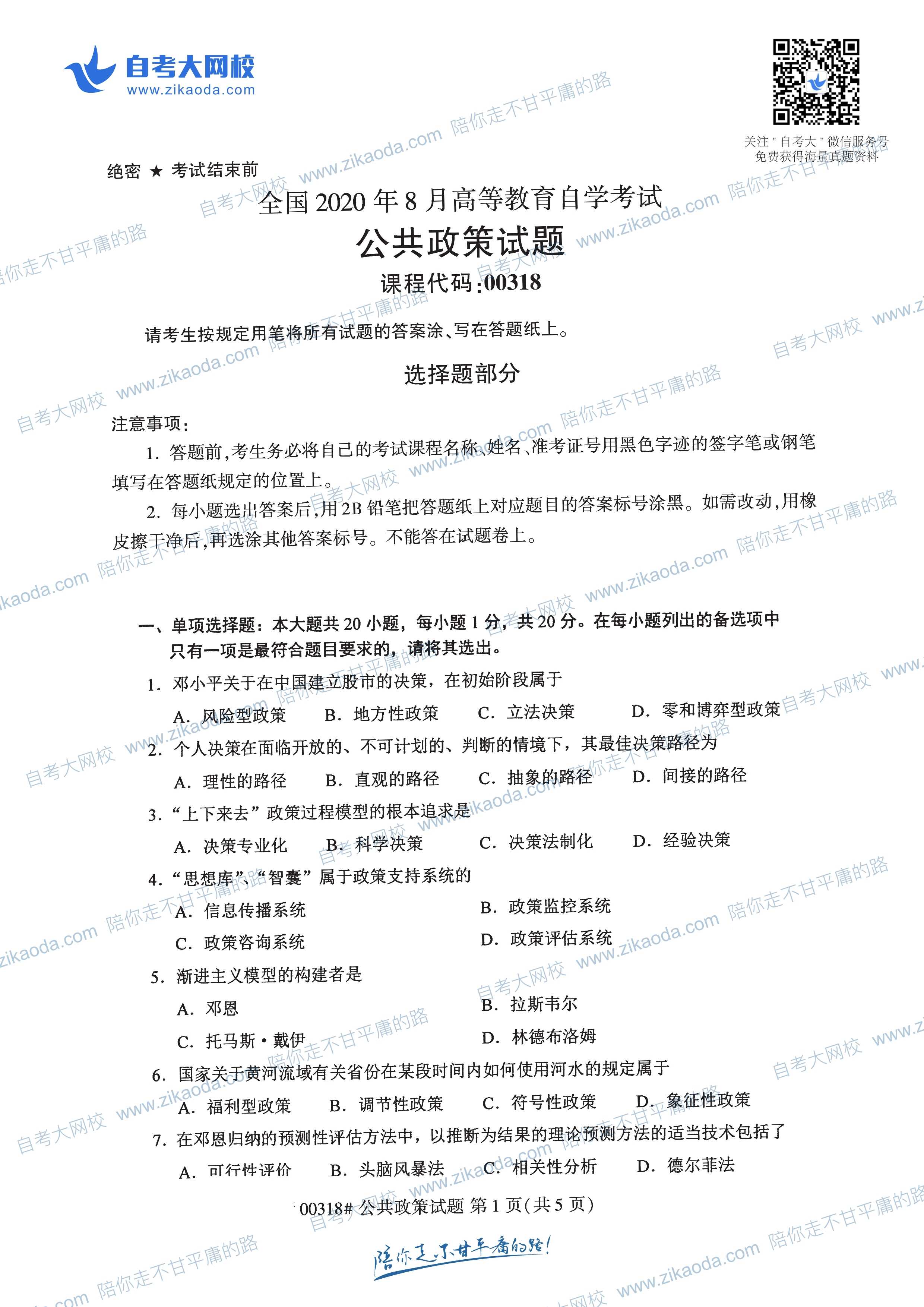 絕密★考試結(jié)束前 全國2014年4月高等教育自學考試 公共政策試題 課程代碼:00318 請考生按規(guī)定用筆將所有試題的答案涂、寫在答題紙上。 選擇題部分 注意事項: 1.答題前,考生務必將自己的考試課程名稱、姓名、準考證號用黑色字跡的簽字筆或鋼筆填寫在答題紙規(guī)定的位置上。 2.每小題選出答案后,用2B鉛筆把答題紙上對應題目的答案標號涂黑。如需改動,用橡皮擦干凈后,再選涂其他答案標號。不能答在試題卷上。 一、單項選擇題(本大題共20小題,每小題1分,共20分) 在每小題列