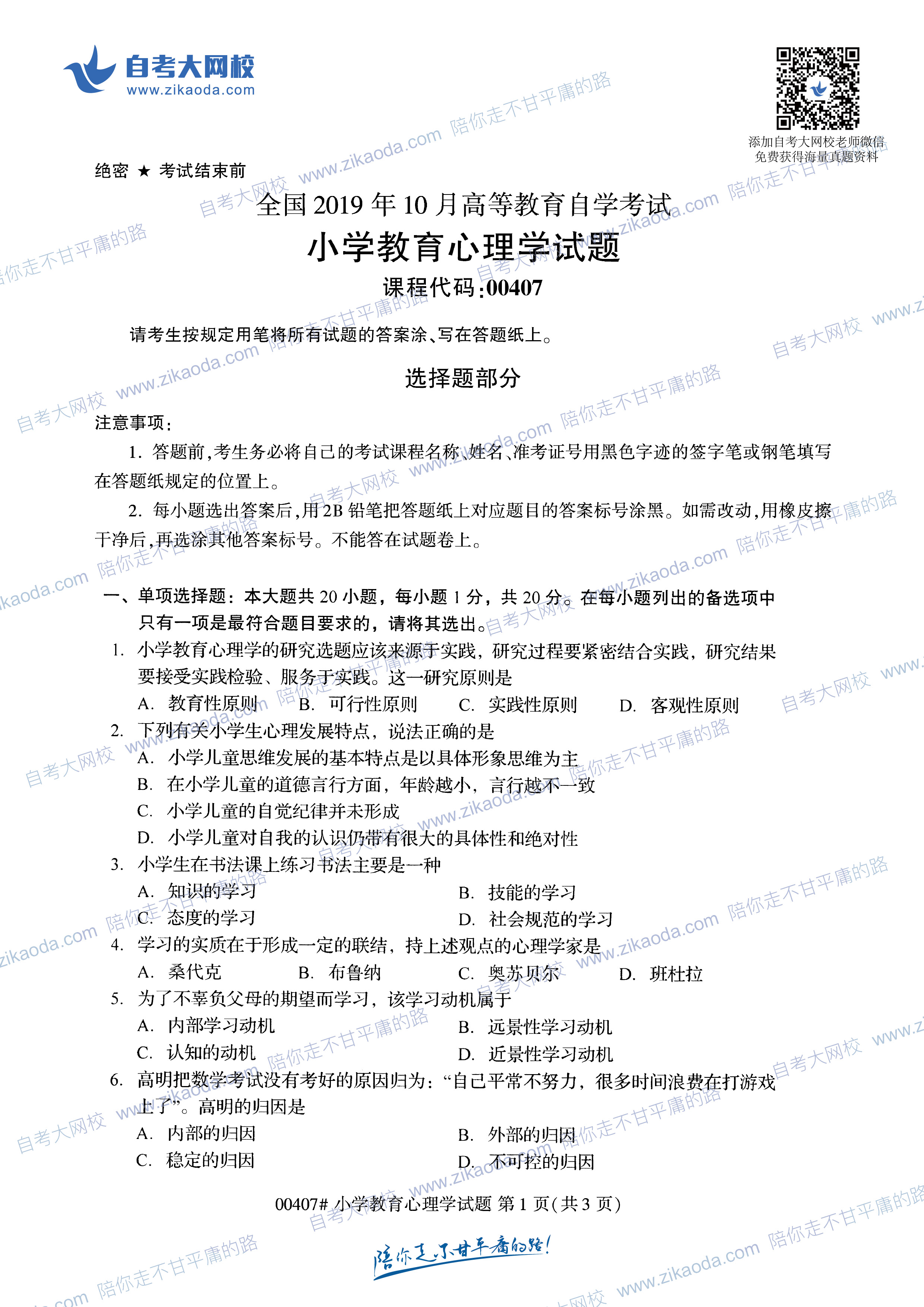 2022年10月全國(guó)自考00407小學(xué)教育心理學(xué)真題試卷已經(jīng)可以免費(fèi)下載,該試卷由江蘇自考網(wǎng)整理