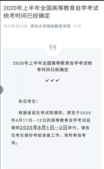 今天貴州大學繼續(xù)教育學院公眾號發(fā)文稱2020年4月自考統(tǒng)考時間定在8月1號、8月2號兩天,但又刪除了。具體最終時間,請等教育部以及省教育考試院公布!自考延期,大家都著急,相信最終時間近期應該會公布!
