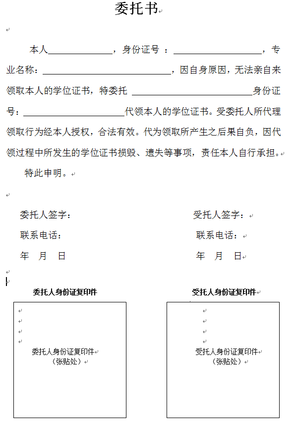 2.委托他人代領(lǐng):代領(lǐng)人身份證原件和復(fù)印件、考生本人身份證復(fù)印件、《委托書》(委托書模板可在附件中下載)。