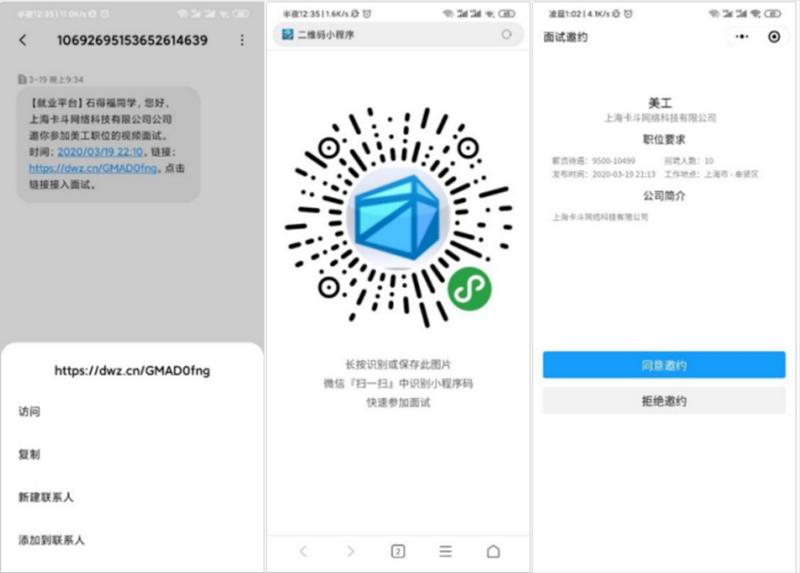 在用人單位處理簡歷后,學(xué)生收到面試邀約的短信,點擊短信鏈接,跳轉(zhuǎn)至小程序面試邀約碼,點擊下載,用微信掃一掃進(jìn)入面試邀約,點擊同意面試或拒絕面試。面試開始前15分鐘,系統(tǒng)會再次發(fā)送面試通知(短信/郵件),方便學(xué)生能夠提前進(jìn)行面試準(zhǔn)備,排隊等待。