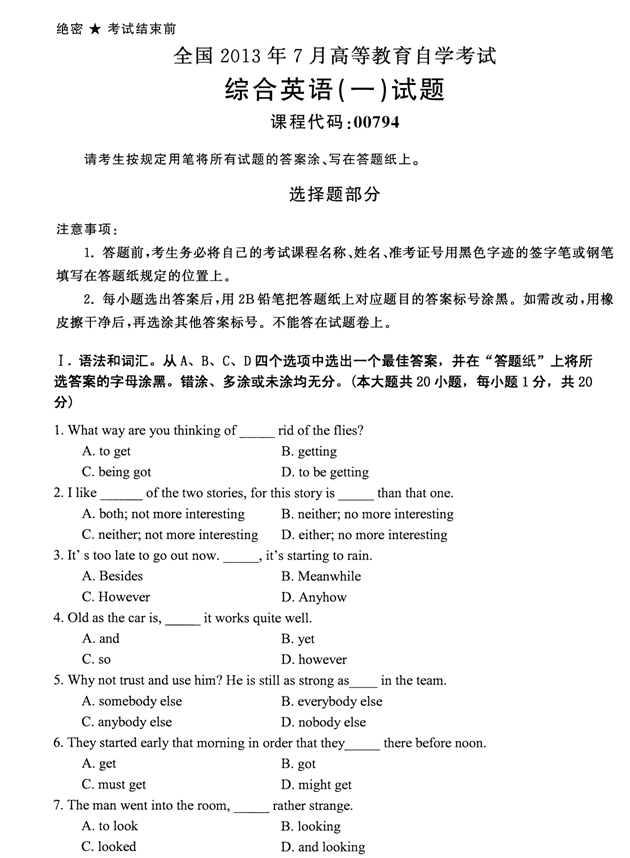 以上是關(guān)于組圖全國2013年7月自考綜合英語一試題已公布的相關(guān)信息,請自考生們認真查看,如果你想獲取最新的江蘇自考新聞或者江蘇自考問題答疑,可以掃描江蘇自考網(wǎng)公眾號二維碼,我們會最第一時間內(nèi)為你解答。