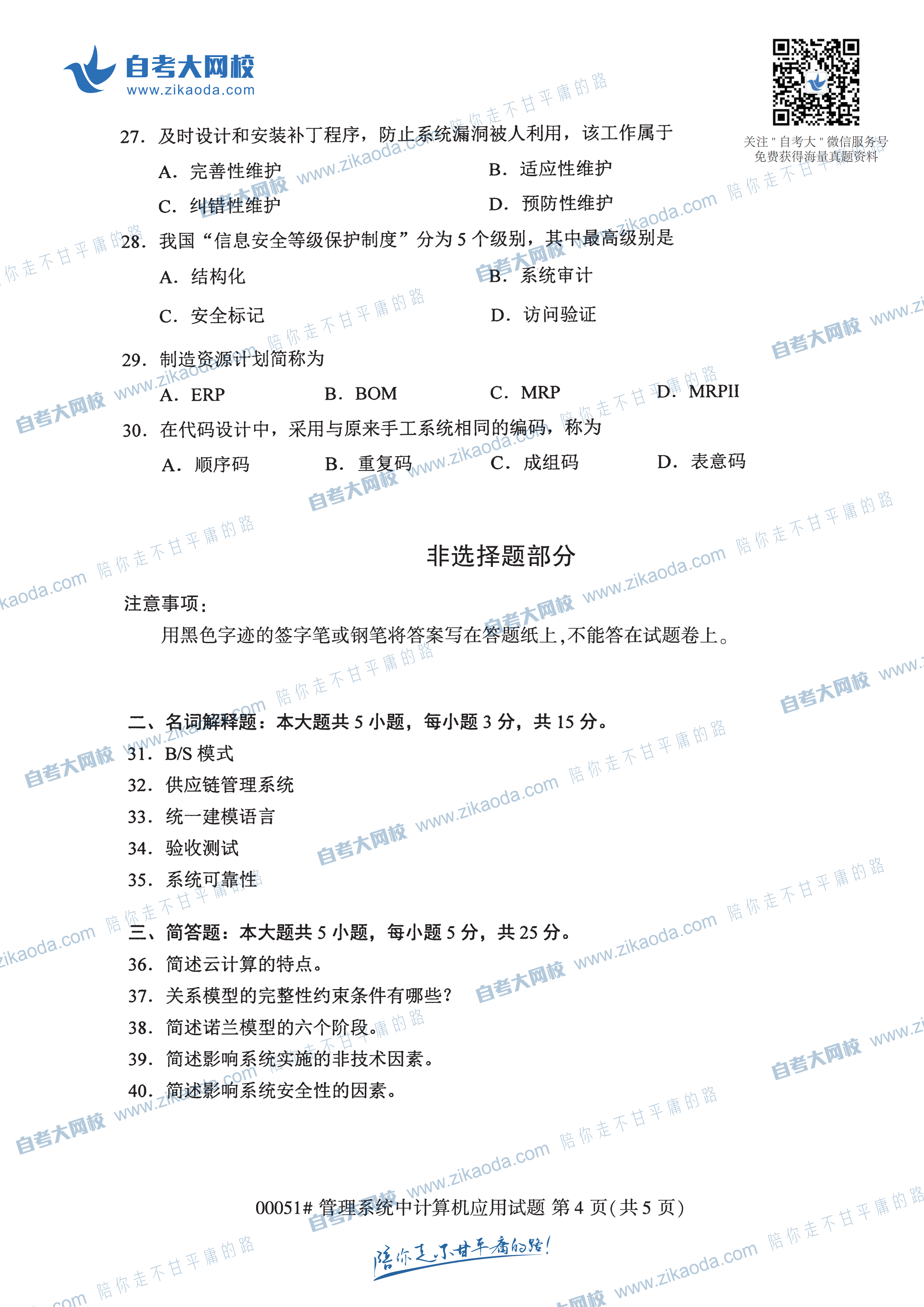 以上是關(guān)于全國2019年4月自考00051管理系統(tǒng)中計算機(jī)應(yīng)用真題試卷免費(fèi)下載已公布的相關(guān)信息,請自考生們認(rèn)真查看,如果你想獲取最新的江蘇自考新聞或者江蘇自考問題答疑,可以掃描江蘇自考網(wǎng)公眾號二維碼,我們會最第一時間內(nèi)為你解答。