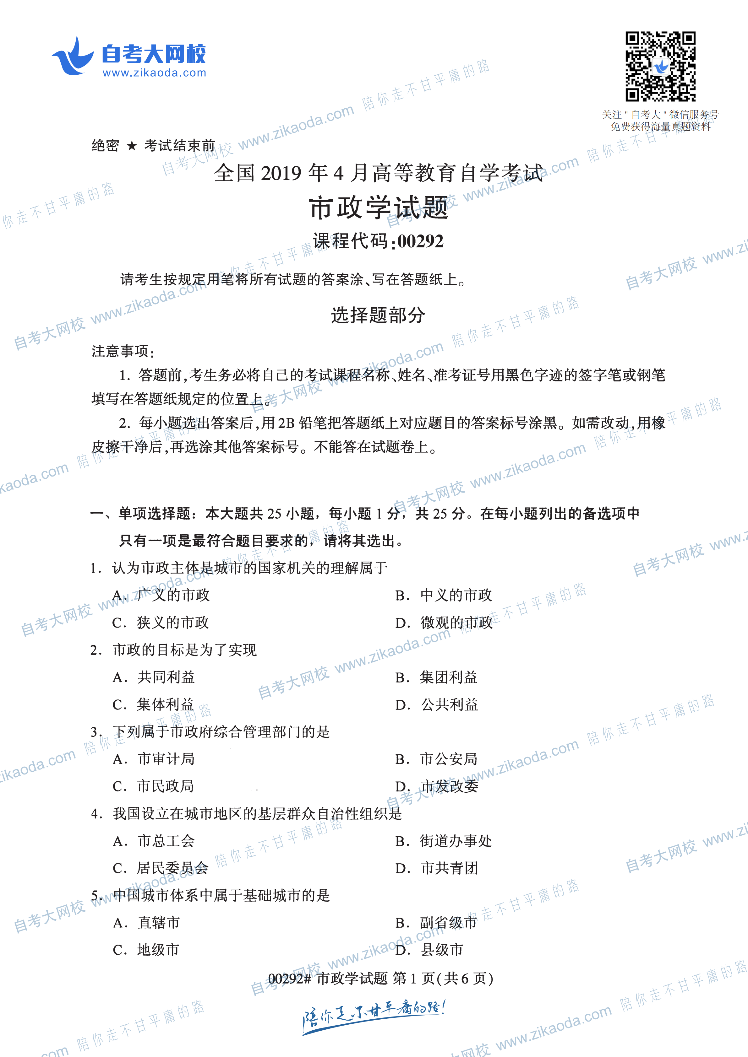 全國(guó)2019年4月自考00292市政學(xué)真題試卷免費(fèi)下載