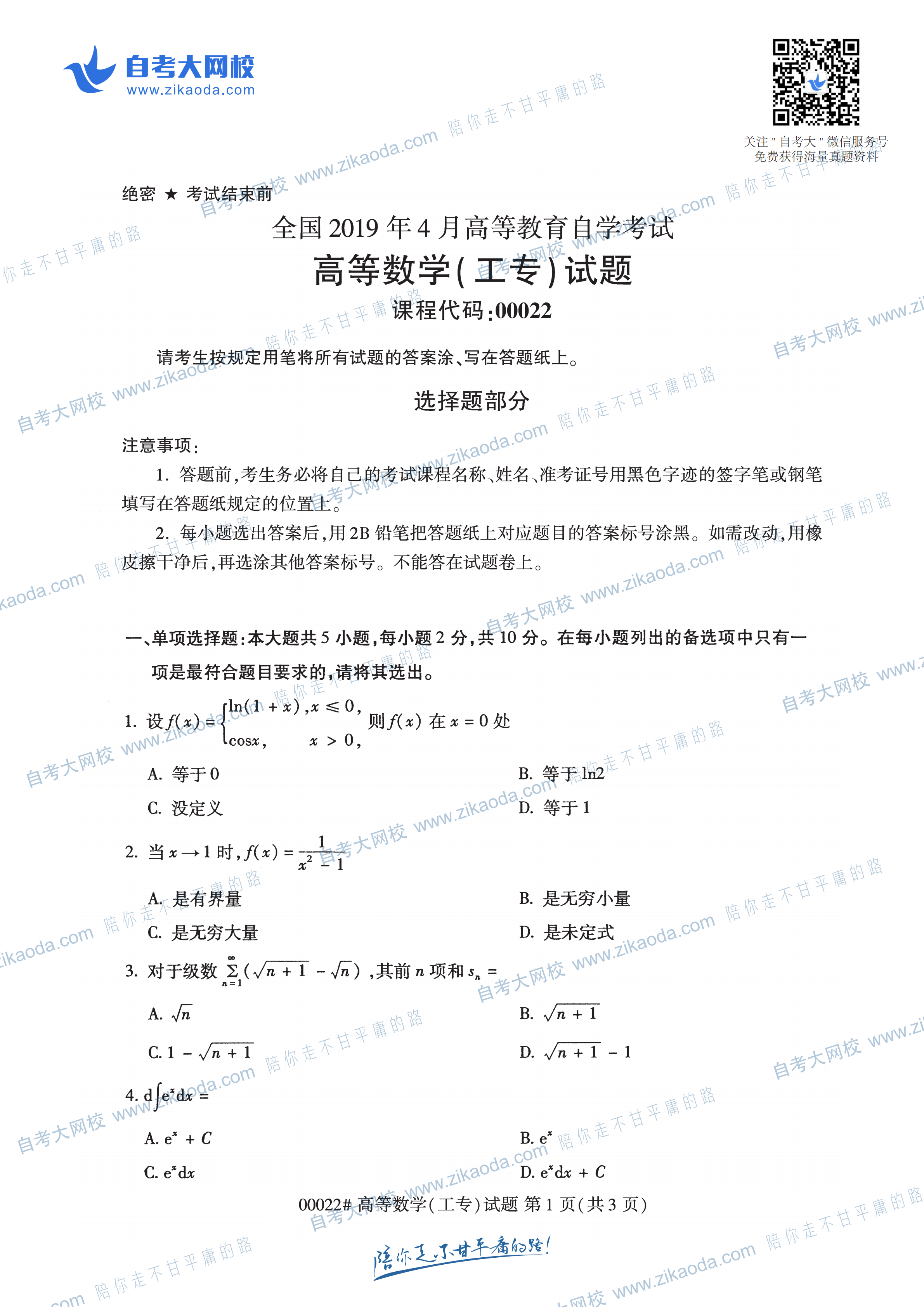 全國2019年4月自考00022高等數(shù)學(xué)(工專) 真題試卷免費下載