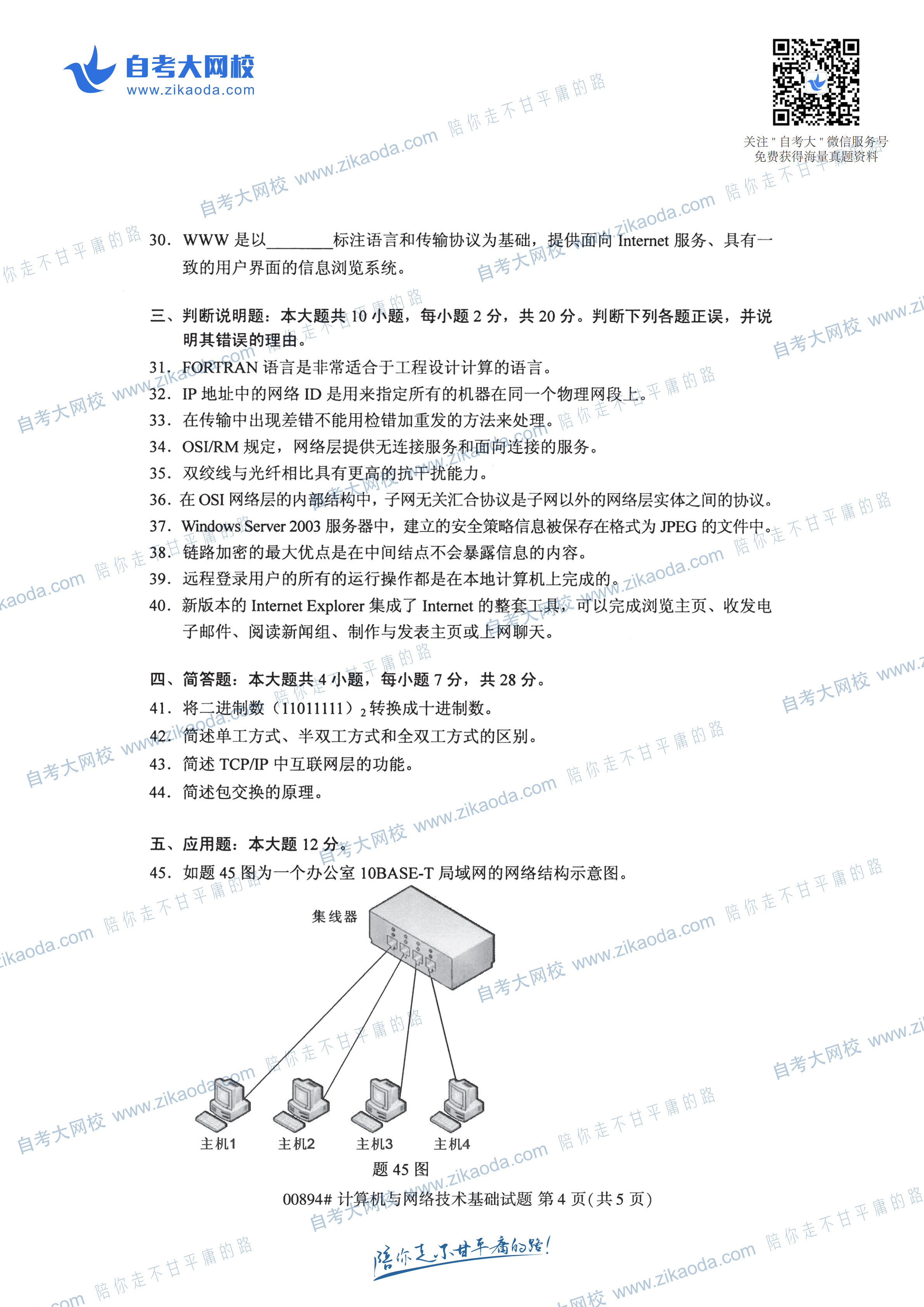 以上是關(guān)于全國2019年4月自考00894計算機(jī)與網(wǎng)絡(luò)技術(shù)基礎(chǔ)真題試卷免費下載已公布的相關(guān)信息,請自考生們認(rèn)真查看,如果你想獲取最新的江蘇自考新聞或者江蘇自考問題答疑,可以掃描江蘇自考網(wǎng)公眾號二維碼,我們會最第一時間內(nèi)為你解答。