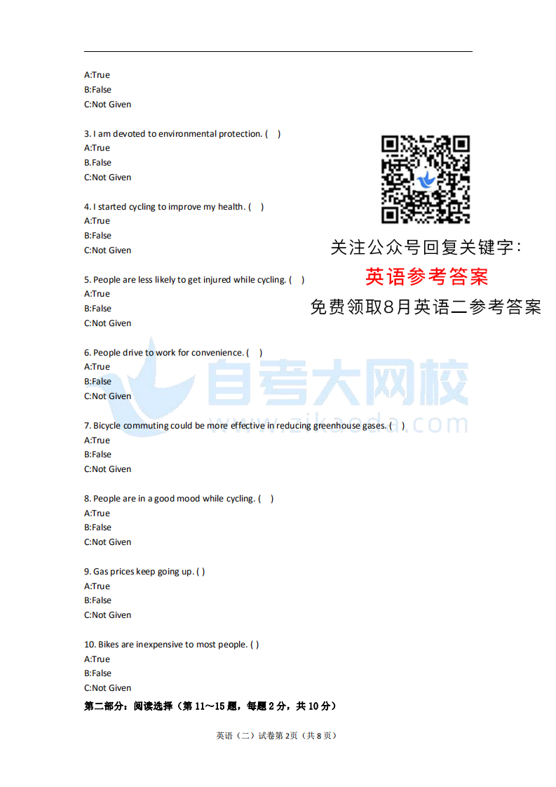 以上是關(guān)于江蘇省2020年8月自考英語二閱讀判斷題真題及答案已公布的相關(guān)信息,請自考生們認真查看,如果你想獲取最新的江蘇自考新聞或者江蘇自考問題答疑,可以掃描江蘇自考網(wǎng)公眾號二維碼,我們會最第一時間內(nèi)為你解答。