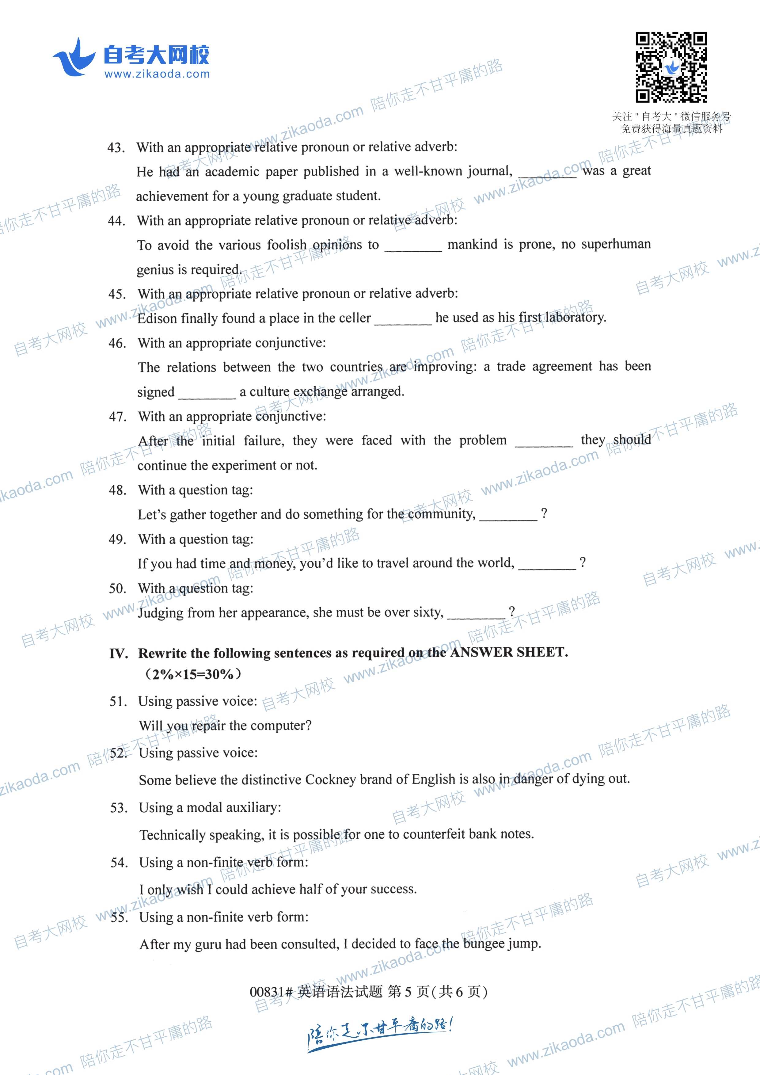 以上是關(guān)于全國2020年8月自考00831英語語法真題試卷已公布的相關(guān)信息,請自考生們認(rèn)真查看,如果你想獲取最新的江蘇自考新聞或者江蘇自考問題答疑,可以掃描江蘇自考網(wǎng)公眾號二維碼,我們會最第一時間內(nèi)為你解答。