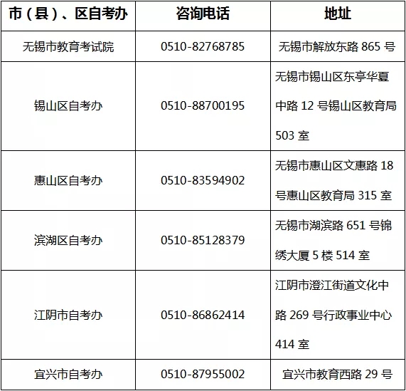 附件:無錫各市(縣)、區(qū)自考辦咨詢電話及地址